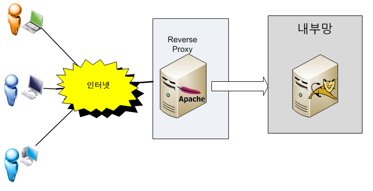 * Reverse Proxy : 외부에서 내부 서버가 제공하는 서비스 접근시, Proxy 서버를 먼저 거쳐서 내부 서버로 들어오는 방식