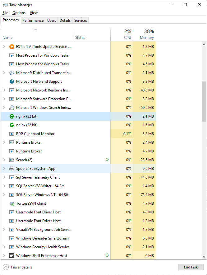 설치는 매우 간단하다. 다운로드 후 압축해제 -> nginx.exe 파일을 실행하면 작업환경 관리자에서 구동중인