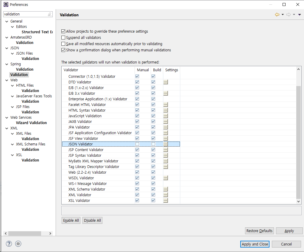 JSON -> JSON Files -> Validation 에서 Configure Project Specific Settings.. 선택