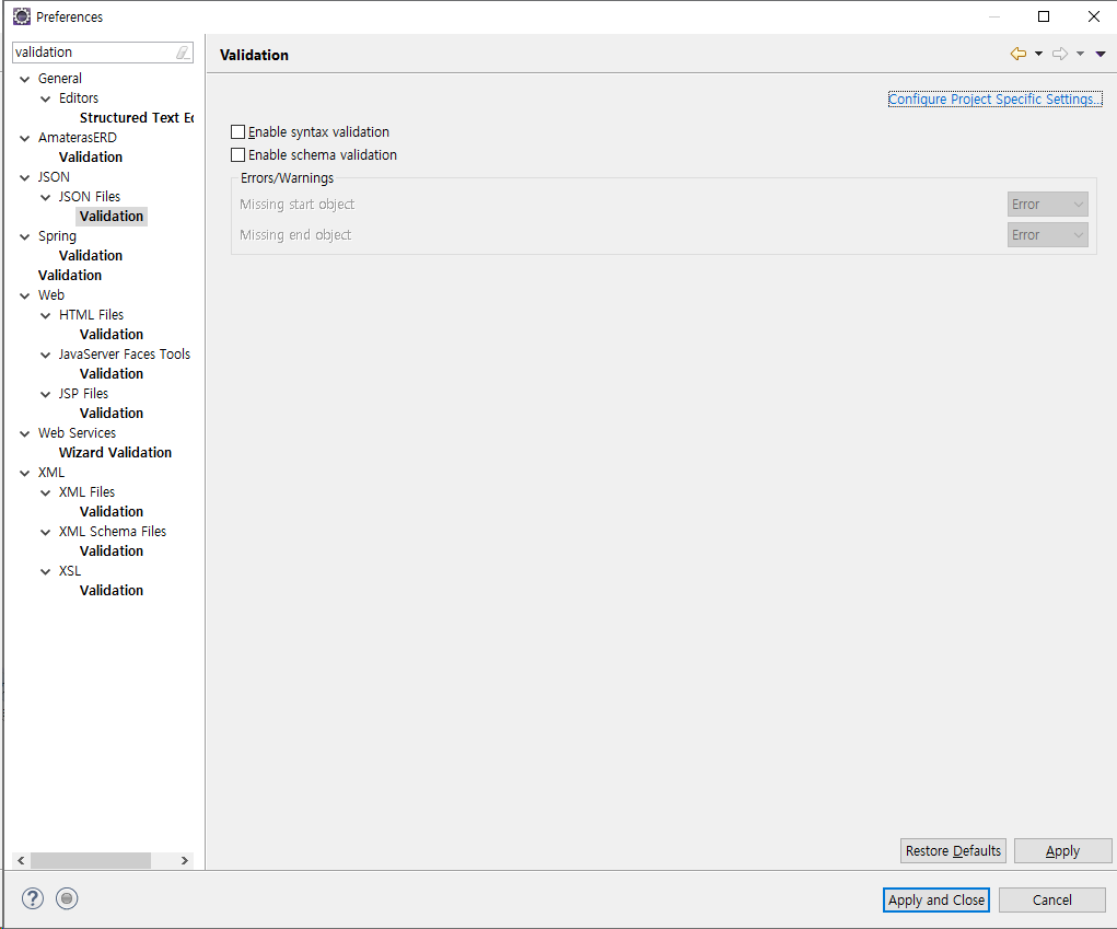 해당 내용을 적용할 프로젝트 선택 후 Enable syntax validation, Enable schema validation 체크 후