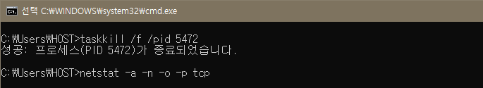 1. cmd창에서 중복되는 포트들을 사용하고 있는 PID를 확인 후 강제 종료한다.