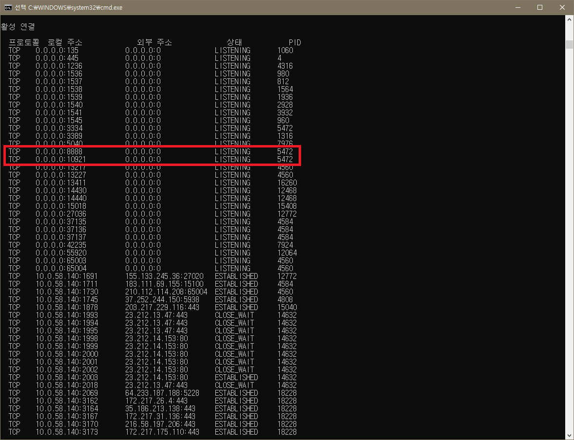 현재 8888 포트를 사용중인 pid 5472 킬 taskkill /f /pid 5472 |